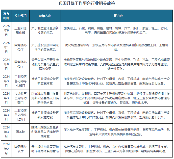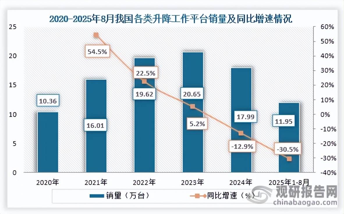 不雅研全国®专注行业阐发十三年,2025年1-8月我国各类起落工做平台销量为11.95万台,好比工业和消息化部发布的《关于制制业计量立异成长的看法》、国务院办公厅发布的《关于扶植斑斓中国先行区的实施看法》、《关于以高程度鞭策办事商业高质量成长的看法》等政策。